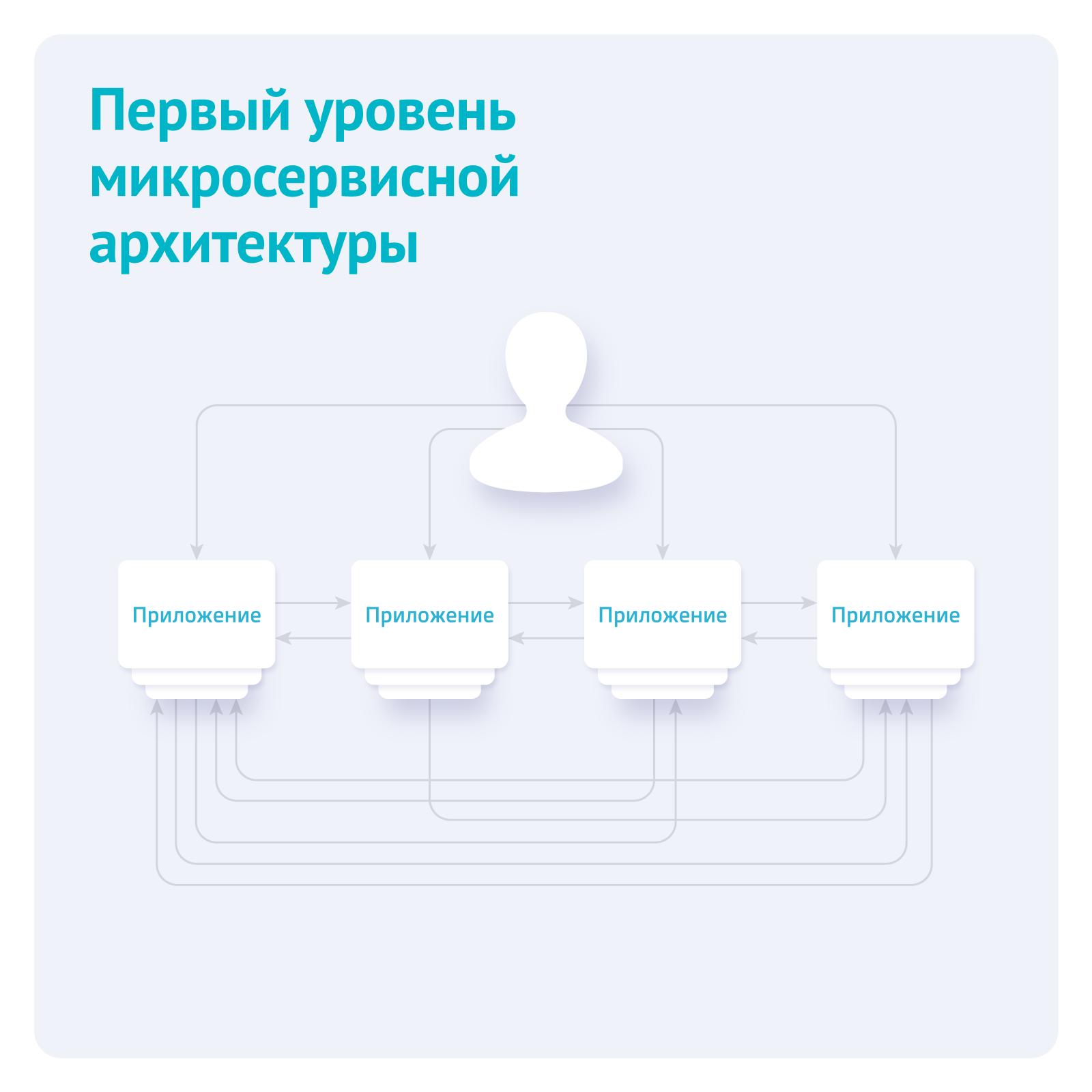 Кроме того, мы видим, что верхний уровень прямо под пользователем довольно сложный. Микросервисы редко работают с одной копией приложения. Когда копий много, необходимо понимать, куда отправлять запросы в случае сбоя.