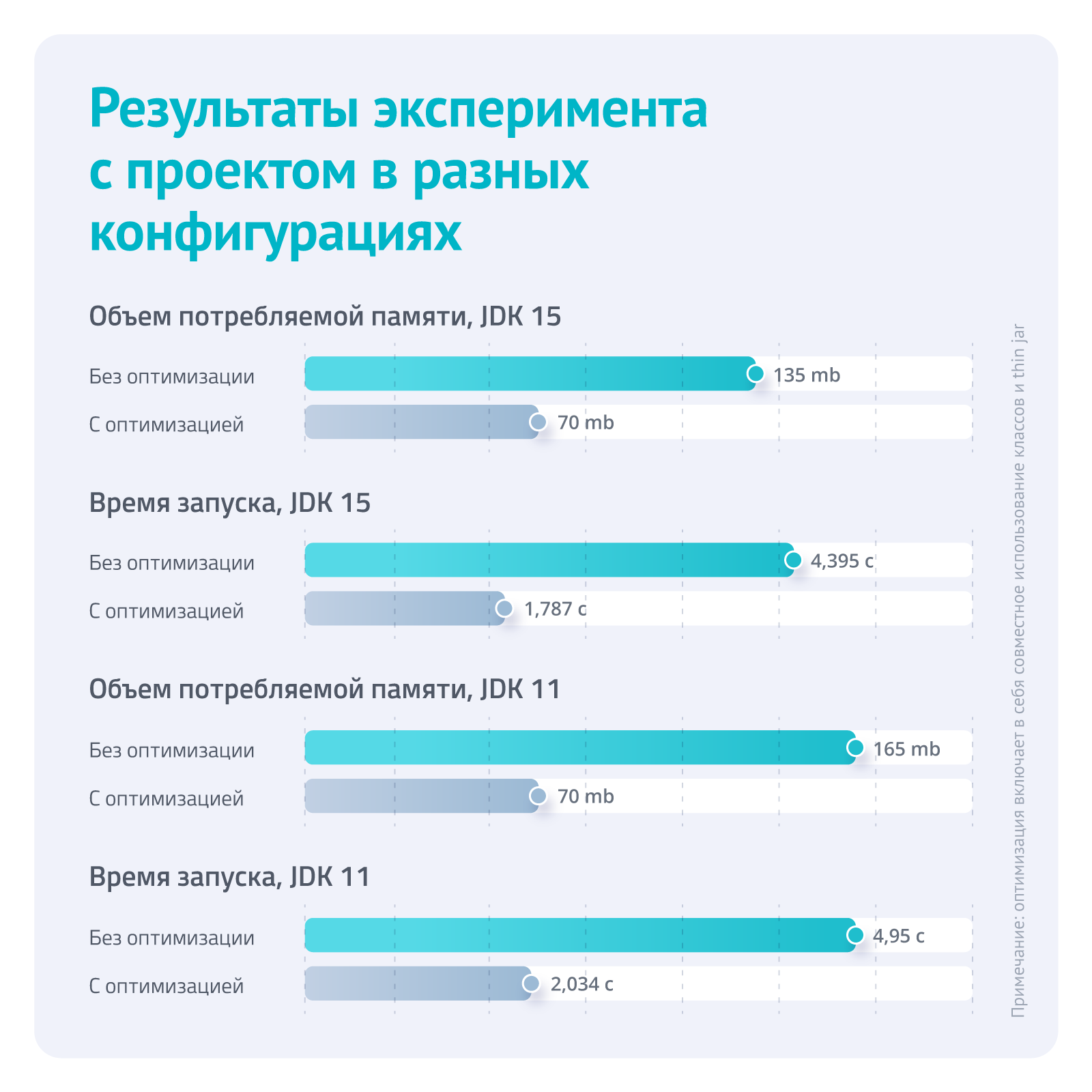 Загрузка классов оказывает значительное влияние на время запуска. Благодаря thin jar и AppCDS скорость запуска выросла почти в 2,5 раза.